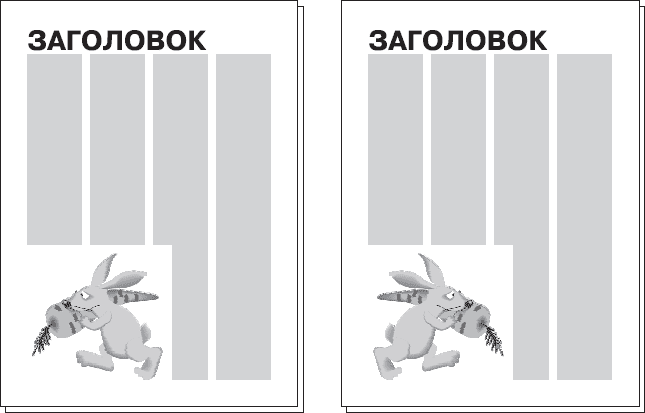 Такая композиция позволяет зрительно «облегчить» полосу. Темные иллюстрации чаще размещают снизу (чтобы они не «задавливали» текст), а светлые чаще ставят вверх страницы (наоборот, чтобы текст не «давил» на иллюстрации) (рис. 4.7). Единых правил по размещению иллюстраций при открытой верстке нет, и во многом дизайнеру придется полагаться на собственный вкус и знания композиции.